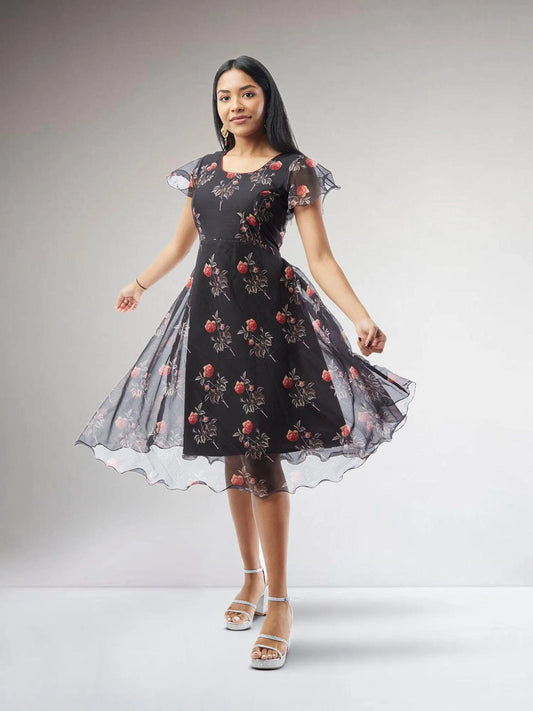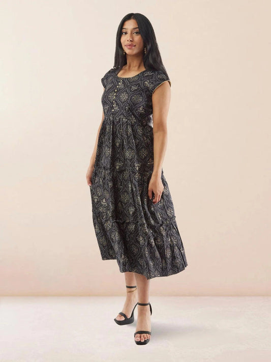 Black Printed Rayon Knee Length Tiered Dress | Indo Western Dress