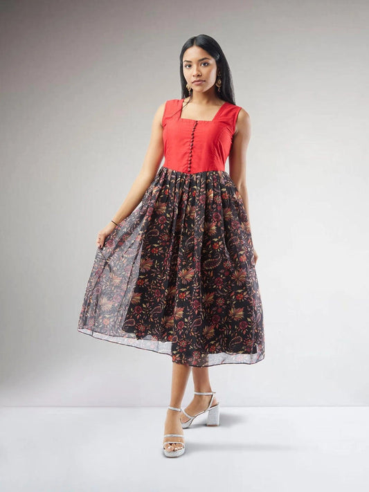 Cream and Red Printed Silk Knee Length Dress | Indo Western Dress