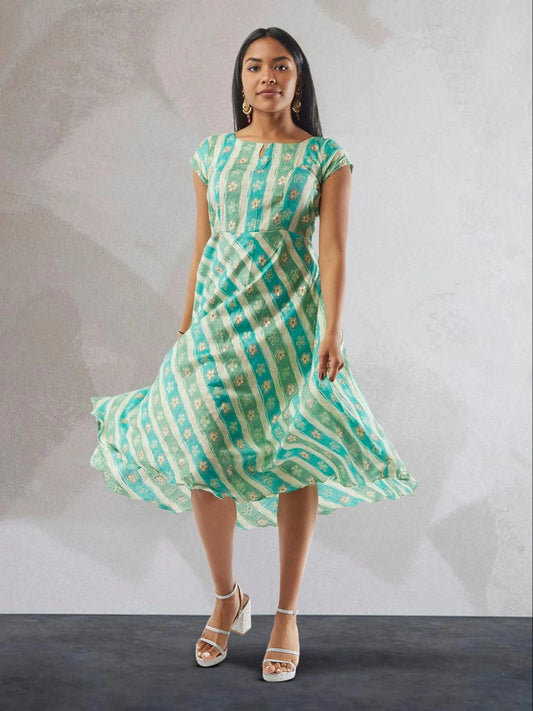 Blue, Green and White Floral Rayon Knee Length Dress | Indo Western Dress