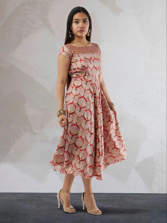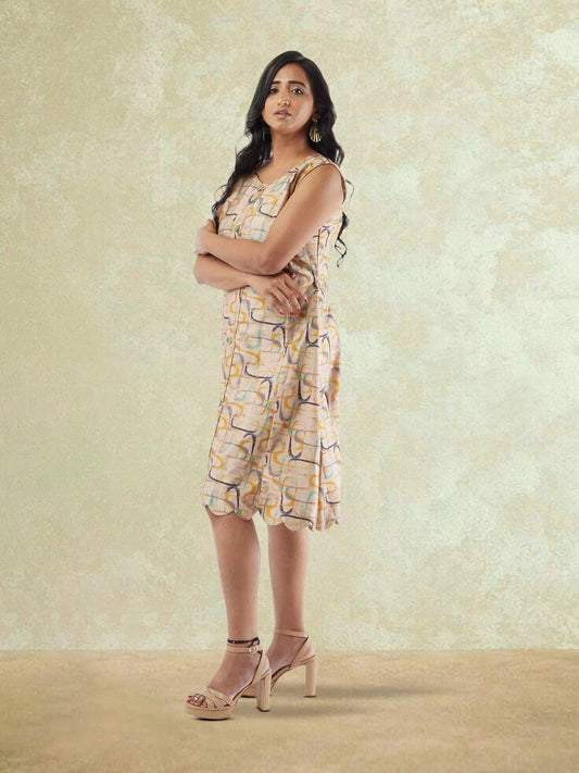 Cream Geometrical Print Raw Silk Knee Length Dress | Indo Western Dress