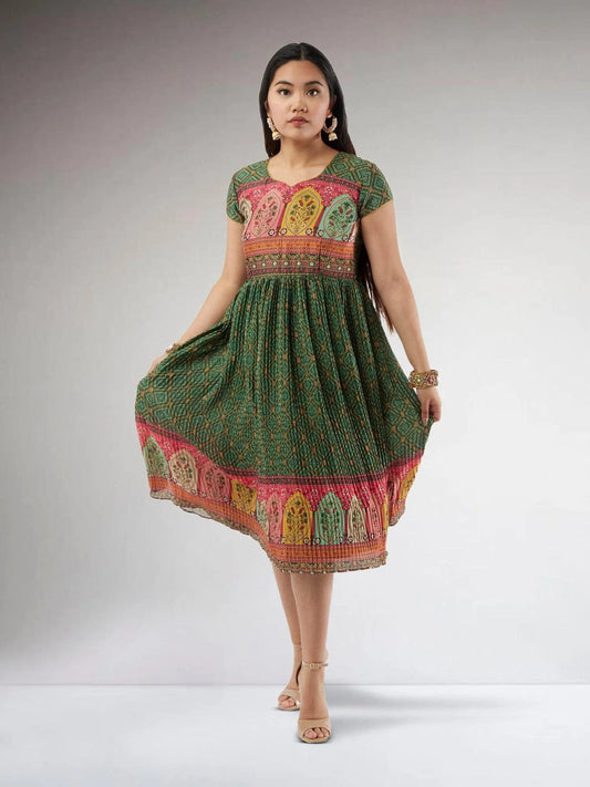 Dark Green Crushed Knee Length Dress | Indo Western Dress
