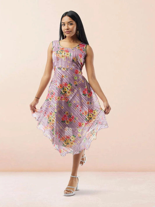 Lavender Floral Printed Chiffon Knee Length Indo Western Dress