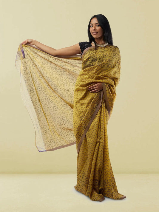 Sarees - Mustard Yellow with Black Geometric Print Mangalagiri Silk Saree