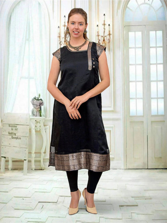 EthnoChic - Black and Gold Color Silk Knee Length Dress