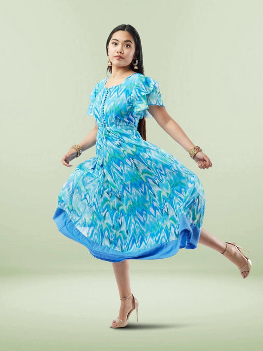 Blue Printed Chiffon Knee Length Dress | Indo Western Dress