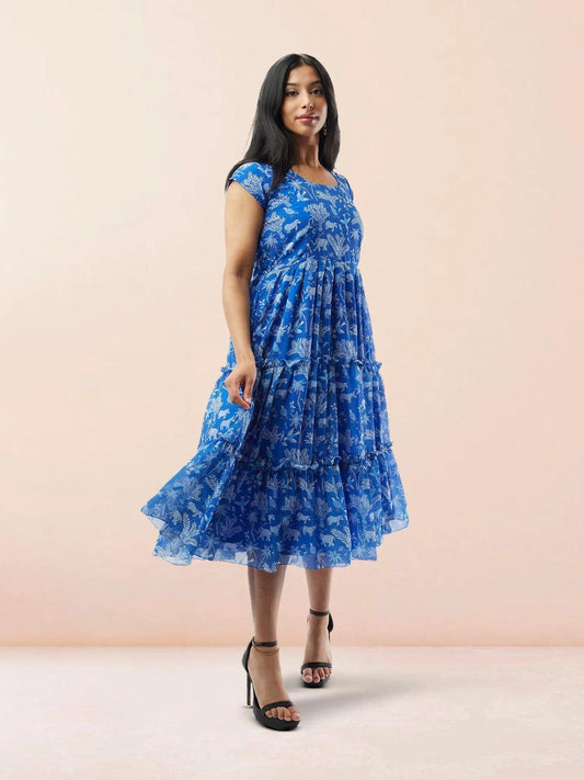 Blue Printed Chiffon Knee Length Tiered Dress | Indo Western Dress