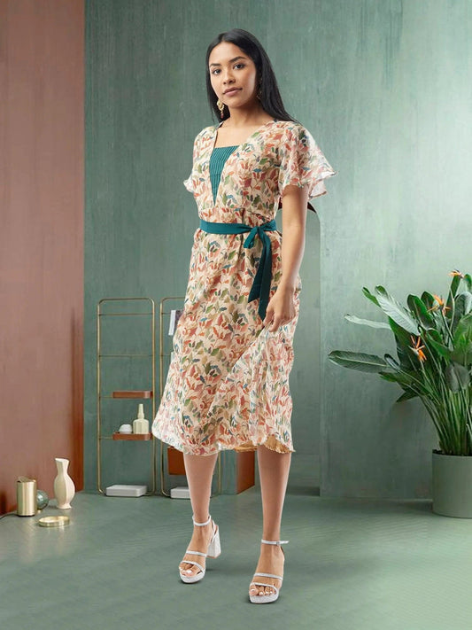 Cream Printed Chiffon Knee Length Dress | Indo Western Dress