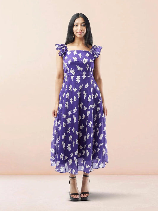 Purple Floral Printed Chiffon Ankle Length Indo Western Dress