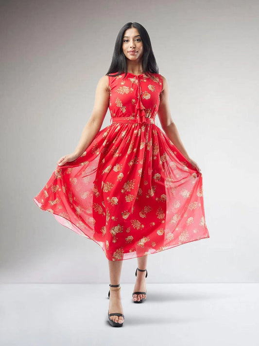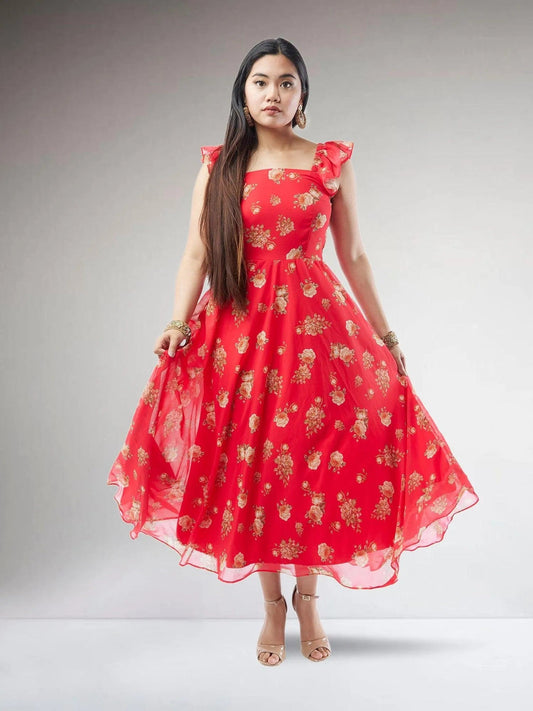Red Printed Chiffon Ankle Length Indo Western Dress